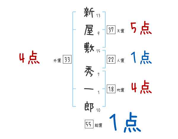天運![]() | 新屋敷秀一郎さんの天運は37画の5つ星!努力家で順応性に優れる。現実的な考え方ができ忠実に物事をこなす。 家系が持つ宿命的な運勢を表します。祖先から受け継いだ苗字ですので自分の力が及びません。家柄を象徴します。 |