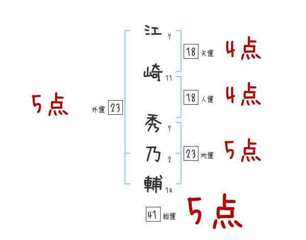 天運![]() | 江崎秀乃輔さんの天運は18画の4つ星!情熱的で剛気。忍耐力があり信頼される。 家系が持つ宿命的な運勢を表します。祖先から受け継いだ苗字ですので自分の力が及びません。家柄を象徴します。 |