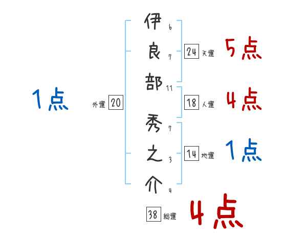 天運![]() | 伊良部秀之介さんの天運は24画の5つ星!家庭運が良く順調な人生。金運にも恵まれる。 家系が持つ宿命的な運勢を表します。祖先から受け継いだ苗字ですので自分の力が及びません。家柄を象徴します。 |