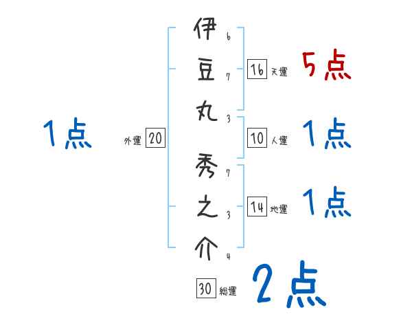 天運![]() | 伊豆丸秀之介さんの天運は16画の5つ星!人望が厚く大きく発展する。逆転成功が見える。 家系が持つ宿命的な運勢を表します。祖先から受け継いだ苗字ですので自分の力が及びません。家柄を象徴します。 |