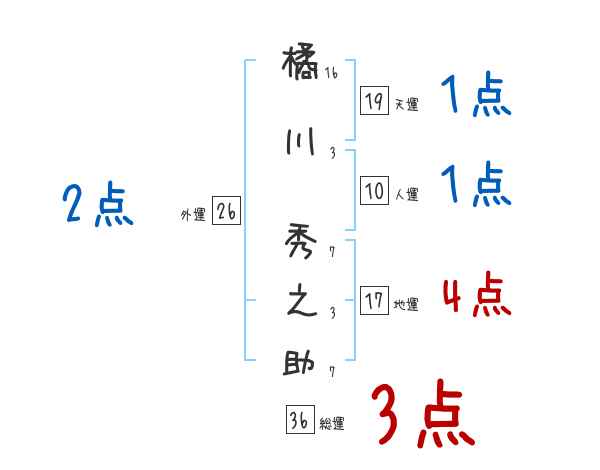 天運![]() | 橘川秀之助さんの天運は19画の1つ星!優れた才能を持ちますが、協調性が足りないことも。周りの人と協力する事を意識しましょう。 家系が持つ宿命的な運勢を表します。祖先から受け継いだ苗字ですので自分の力が及びません。家柄を象徴します。 |
