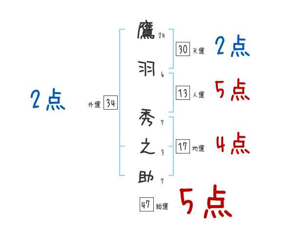 天運![]() | 鷹羽秀之助さんの天運は30画の2つ星!浮き沈みの激しさに注意しましょう。 家系が持つ宿命的な運勢を表します。祖先から受け継いだ苗字ですので自分の力が及びません。家柄を象徴します。 |