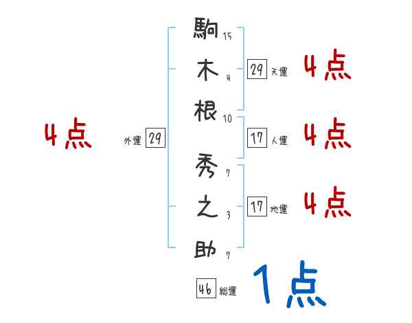 天運![]() | 駒木根秀之助さんの天運は29画の4つ星!完全主義で才能がある。厳格な心の持ち主。 家系が持つ宿命的な運勢を表します。祖先から受け継いだ苗字ですので自分の力が及びません。家柄を象徴します。 |