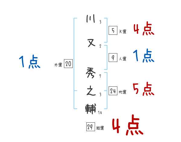 天運![]() | 川又秀之輔さんの天運は5画の4つ星!健康で安泰。協調性に優れ、財産に恵まれる。 家系が持つ宿命的な運勢を表します。祖先から受け継いだ苗字ですので自分の力が及びません。家柄を象徴します。 |