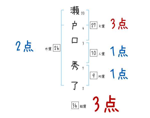 天運![]()  | 瀬戸口秀了さんの天運は27画の3つ星!頭脳明晰だが強情で摩擦が多い傾向。孤立に注意。 家系が持つ宿命的な運勢を表します。祖先から受け継いだ苗字ですので自分の力が及びません。家柄を象徴します。 |