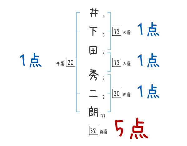 総運![]() | 井下田秀二朗さんの総運は32画の5つ星!柔軟性があり成功する。チャンスが多く金運が良い。 あなたの人生を表す1番重要な運勢です。生涯を通じて影響する総合運となり、主に50歳以降の晩年期に影響を及ぼします。 |