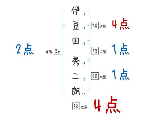天運![]() | 伊豆田秀二朗さんの天運は18画の4つ星!情熱的で剛気。忍耐力があり信頼される。 家系が持つ宿命的な運勢を表します。祖先から受け継いだ苗字ですので自分の力が及びません。家柄を象徴します。 |