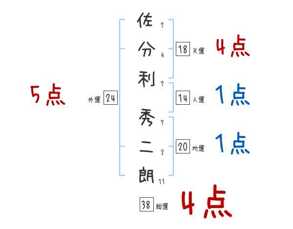 外運![]() | 佐分利秀二朗さんの外運は24画の5つ星!家庭運が良く順調な人生。金運にも恵まれる。 生活面を象徴する運勢です。外部から受ける影響力を表し、結婚運、家庭運や職場、環境への順応性を表します。 |