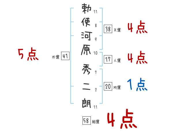 総運![]() | 勅使河原秀二朗さんの総運は58画の4つ星!安定した生活。大器晩成タイプ。 あなたの人生を表す1番重要な運勢です。生涯を通じて影響する総合運となり、主に50歳以降の晩年期に影響を及ぼします。 |