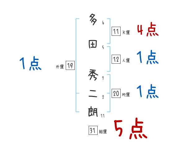 外運![]() | 多田秀二朗さんの外運は19画の1つ星!優れた才能を持ちますが、協調性が足りないことも。周りの人と協力する事を意識しましょう。 生活面を象徴する運勢です。外部から受ける影響力を表し、結婚運、家庭運や職場、環境への順応性を表します。 |