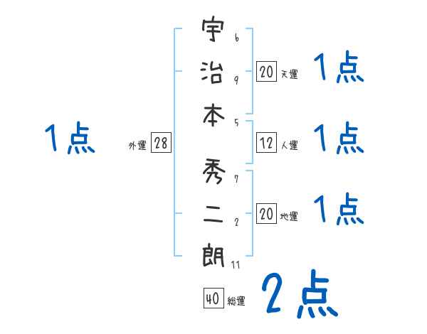 外運![]() | 宇治本秀二朗さんの外運は28画の1つ星!家庭環境に注意。スポーツで活躍できる能力があるかも。 生活面を象徴する運勢です。外部から受ける影響力を表し、結婚運、家庭運や職場、環境への順応性を表します。 |