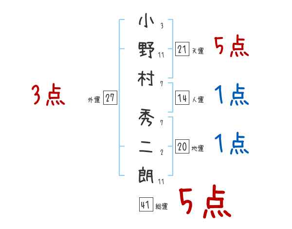 天運![]() | 小野村秀二朗さんの天運は21画の5つ星!統率力がある。独立し成功する。名誉を手に入れる。 家系が持つ宿命的な運勢を表します。祖先から受け継いだ苗字ですので自分の力が及びません。家柄を象徴します。 |