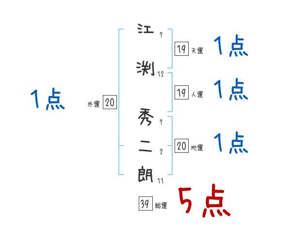 天運![]() | 江渕秀二朗さんの天運は19画の1つ星!優れた才能を持ちますが、協調性が足りないことも。周りの人と協力する事を意識しましょう。 家系が持つ宿命的な運勢を表します。祖先から受け継いだ苗字ですので自分の力が及びません。家柄を象徴します。 |