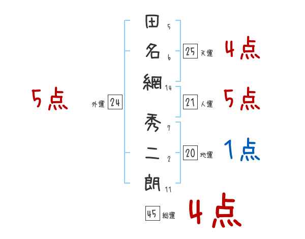 総運![]() | 田名網秀二朗さんの総運は45画の4つ星!もくもくと物事を進め達成する。地味な努力家。 あなたの人生を表す1番重要な運勢です。生涯を通じて影響する総合運となり、主に50歳以降の晩年期に影響を及ぼします。 |