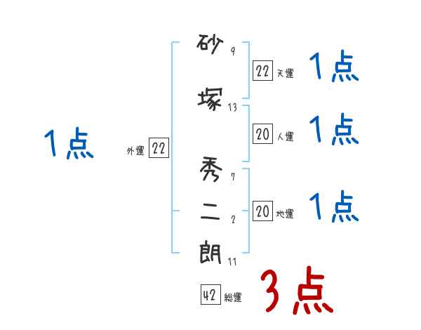 外運![]() | 砂塚秀二朗さんの外運は22画の1つ星!努力することが苦手ないっぽう手先が器用。芸術性にも優れる。 生活面を象徴する運勢です。外部から受ける影響力を表し、結婚運、家庭運や職場、環境への順応性を表します。 |