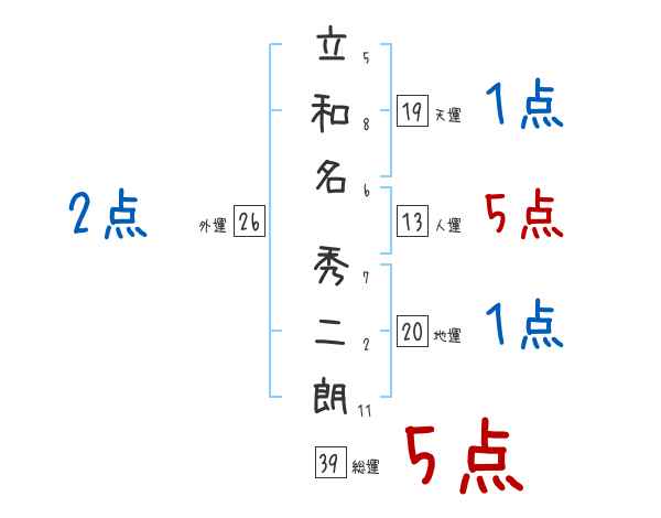 総運![]() | 立和名秀二朗さんの総運は39画の5つ星!社交性に優れ人望が厚い。人の上に立ち成功する。 あなたの人生を表す1番重要な運勢です。生涯を通じて影響する総合運となり、主に50歳以降の晩年期に影響を及ぼします。 |