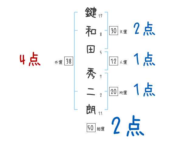 天運![]() | 鍵和田秀二朗さんの天運は30画の2つ星!浮き沈みの激しさに注意しましょう。 家系が持つ宿命的な運勢を表します。祖先から受け継いだ苗字ですので自分の力が及びません。家柄を象徴します。 |