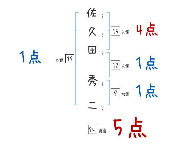 | 天運  | 佐久田秀二さんの天運は15画の4つ星!人徳があり出世する。順調に物事を進め円満な人生。家系が持つ宿命的な運勢を表します。祖先から受け継いだ苗字ですので自分の力が及びません。家柄を象徴します。 |