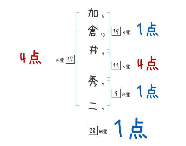 外運![]() | 加倉井秀二さんの外運は17画の4つ星!積極的な行動力。地位を気づき財産を手に入れる。純粋な心と直感力。 生活面を象徴する運勢です。外部から受ける影響力を表し、結婚運、家庭運や職場、環境への順応性を表します。 |