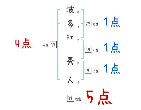 外運![]() | 波多江秀人さんの外運は17画の4つ星!積極的な行動力。地位を気づき財産を手に入れる。純粋な心と直感力。 生活面を象徴する運勢です。外部から受ける影響力を表し、結婚運、家庭運や職場、環境への順応性を表します。 |