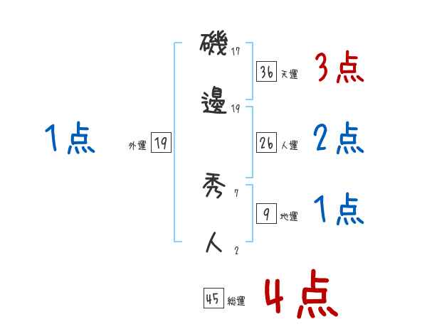 外運![]() | 磯邊秀人さんの外運は19画の1つ星!優れた才能を持ちますが、協調性が足りないことも。周りの人と協力する事を意識しましょう。 生活面を象徴する運勢です。外部から受ける影響力を表し、結婚運、家庭運や職場、環境への順応性を表します。 |