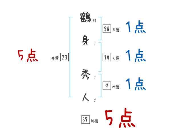 総運![]() | 鶴身秀人さんの総運は37画の5つ星!努力家で順応性に優れる。現実的な考え方ができ忠実に物事をこなす。 あなたの人生を表す1番重要な運勢です。生涯を通じて影響する総合運となり、主に50歳以降の晩年期に影響を及ぼします。 |