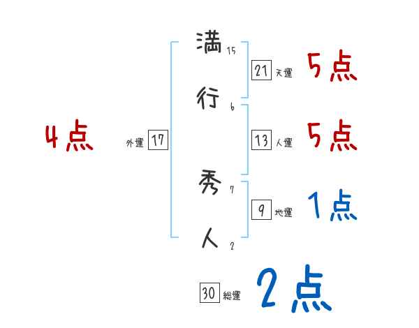 天運![]() | 満行秀人さんの天運は21画の5つ星!統率力がある。独立し成功する。名誉を手に入れる。 家系が持つ宿命的な運勢を表します。祖先から受け継いだ苗字ですので自分の力が及びません。家柄を象徴します。 |