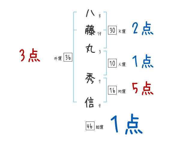 天運![]() | 八藤丸秀信さんの天運は30画の2つ星!浮き沈みの激しさに注意しましょう。 家系が持つ宿命的な運勢を表します。祖先から受け継いだ苗字ですので自分の力が及びません。家柄を象徴します。 |