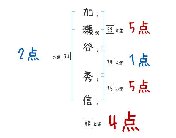 天運![]() | 加瀬谷秀信さんの天運は32画の5つ星!柔軟性があり成功する。チャンスが多く金運が良い。 家系が持つ宿命的な運勢を表します。祖先から受け継いだ苗字ですので自分の力が及びません。家柄を象徴します。 |