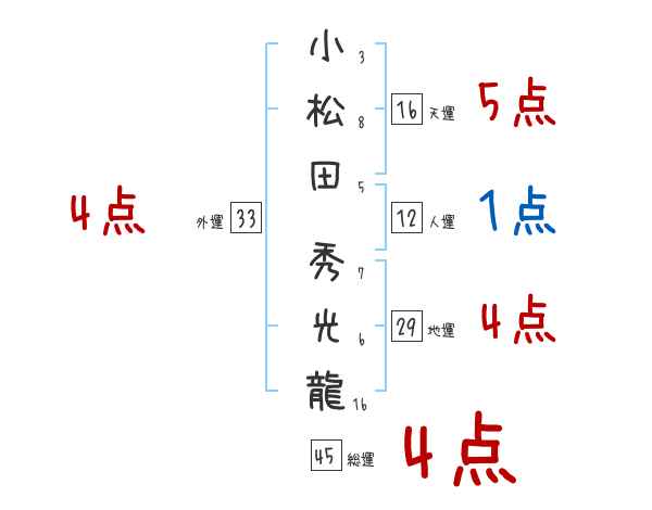 天運![]() | 小松田秀光龍さんの天運は16画の5つ星!人望が厚く大きく発展する。逆転成功が見える。 家系が持つ宿命的な運勢を表します。祖先から受け継いだ苗字ですので自分の力が及びません。家柄を象徴します。 |
