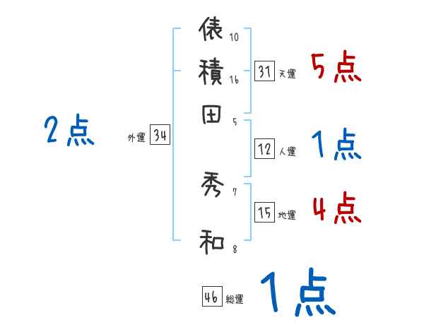 外運![]() | 俵積田秀和さんの外運は34画の2つ星!独創性に優れるが、自尊心が強く災難に注意しましょう。 生活面を象徴する運勢です。外部から受ける影響力を表し、結婚運、家庭運や職場、環境への順応性を表します。 |