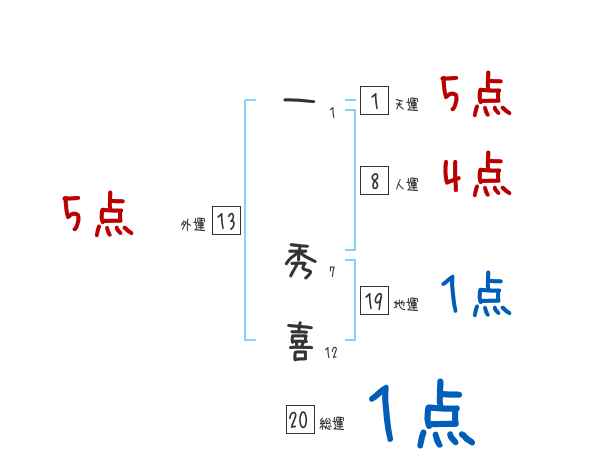 天運![]() | 一秀喜さんの天運は1画の5つ星!行動力、指導力があり出世し繁栄する。幸運に恵まれる。 家系が持つ宿命的な運勢を表します。祖先から受け継いだ苗字ですので自分の力が及びません。家柄を象徴します。 |
