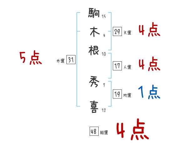 外運![]() | 駒木根秀喜さんの外運は31画の5つ星!社交性があり判断力に優れる。順風満帆な人生で円満な生活。 生活面を象徴する運勢です。外部から受ける影響力を表し、結婚運、家庭運や職場、環境への順応性を表します。 |