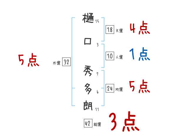 外運![]() | 樋口秀多朗さんの外運は32画の5つ星!柔軟性があり成功する。チャンスが多く金運が良い。 生活面を象徴する運勢です。外部から受ける影響力を表し、結婚運、家庭運や職場、環境への順応性を表します。 |