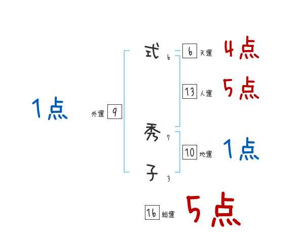外運![]() | 式秀子さんの外運は9画の1つ星!消極的で才能を発揮することが苦手なことも。周りの意見に耳を傾けましょう。 生活面を象徴する運勢です。外部から受ける影響力を表し、結婚運、家庭運や職場、環境への順応性を表します。 |