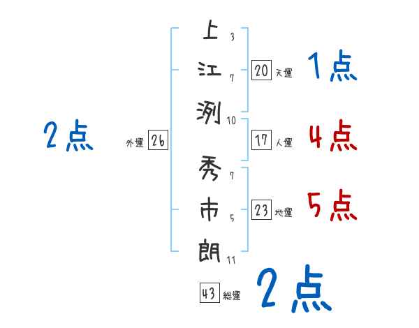 人運![]() | 上江洌秀市朗さんの人運は17画の4つ星!積極的な行動力。地位を気づき財産を手に入れる。純粋な心と直感力。 性格や才能などを表す2番目に重要な運勢です。人間関係や協調性、社会的な成功に影響します。主に20歳から50歳ぐらいまでの中年期の運勢を表します。 |