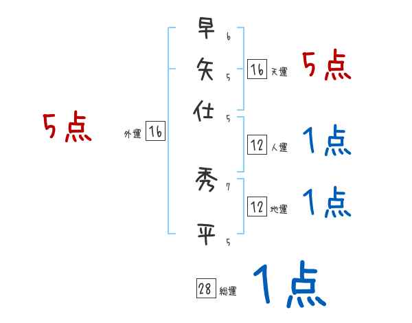 天運![]() | 早矢仕秀平さんの天運は16画の5つ星!人望が厚く大きく発展する。逆転成功が見える。 家系が持つ宿命的な運勢を表します。祖先から受け継いだ苗字ですので自分の力が及びません。家柄を象徴します。 |
