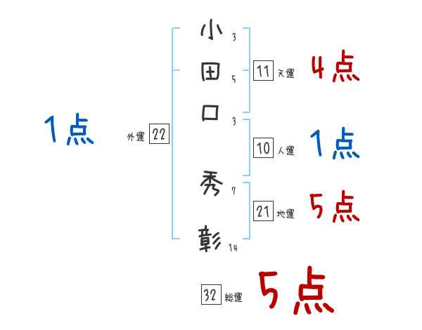 天運![]() | 小田口秀彰さんの天運は11画の4つ星!着実に富や地位を得る幸運な人生。 家系が持つ宿命的な運勢を表します。祖先から受け継いだ苗字ですので自分の力が及びません。家柄を象徴します。 |