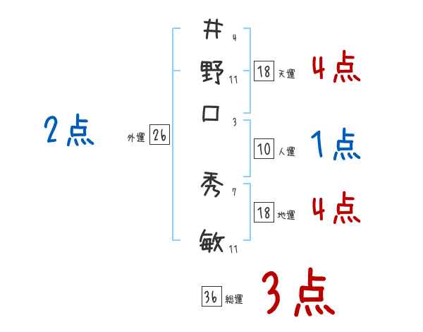 天運![]() | 井野口秀敏さんの天運は18画の4つ星!情熱的で剛気。忍耐力があり信頼される。 家系が持つ宿命的な運勢を表します。祖先から受け継いだ苗字ですので自分の力が及びません。家柄を象徴します。 |