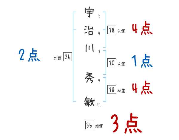 天運![]() | 宇治川秀敏さんの天運は18画の4つ星!情熱的で剛気。忍耐力があり信頼される。 家系が持つ宿命的な運勢を表します。祖先から受け継いだ苗字ですので自分の力が及びません。家柄を象徴します。 |