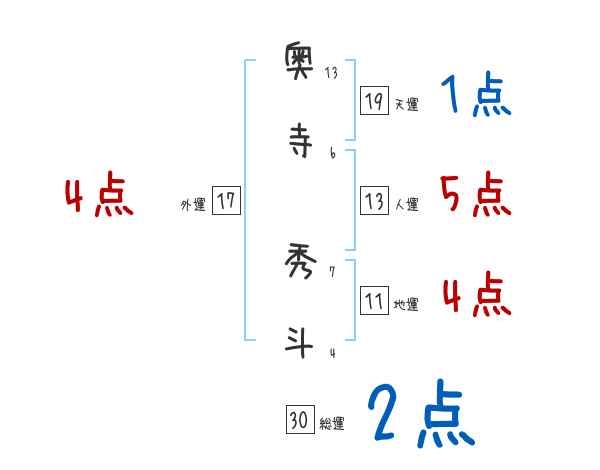 外運![]() | 奥寺秀斗さんの外運は17画の4つ星!積極的な行動力。地位を気づき財産を手に入れる。純粋な心と直感力。 生活面を象徴する運勢です。外部から受ける影響力を表し、結婚運、家庭運や職場、環境への順応性を表します。 |