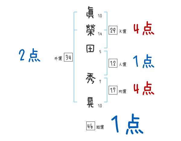 天運![]() | 眞榮田秀晃さんの天運は29画の4つ星!完全主義で才能がある。厳格な心の持ち主。 家系が持つ宿命的な運勢を表します。祖先から受け継いだ苗字ですので自分の力が及びません。家柄を象徴します。 |