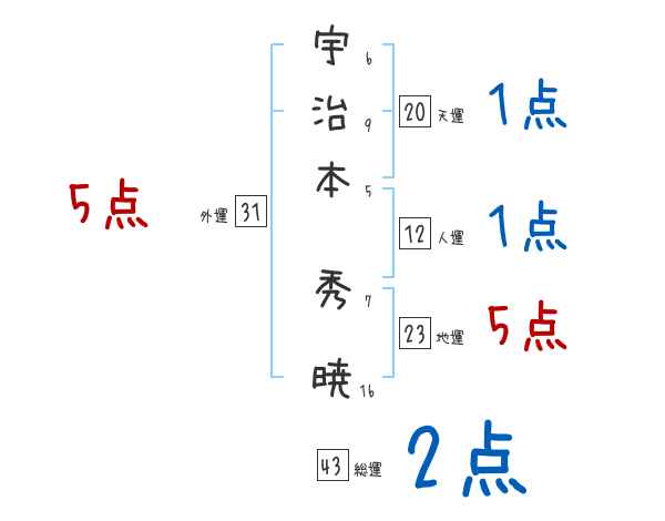 外運![]() | 宇治本秀暁さんの外運は31画の5つ星!社交性があり判断力に優れる。順風満帆な人生で円満な生活。 生活面を象徴する運勢です。外部から受ける影響力を表し、結婚運、家庭運や職場、環境への順応性を表します。 |