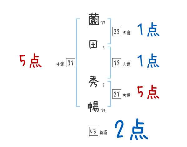 天運![]() | 薗田秀暢さんの天運は22画の1つ星!努力することが苦手ないっぽう手先が器用。芸術性にも優れる。 家系が持つ宿命的な運勢を表します。祖先から受け継いだ苗字ですので自分の力が及びません。家柄を象徴します。 |