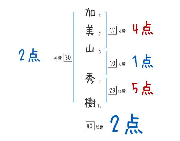人運![]() | 加美山秀樹さんの人運は10画の1つ星!不安を感じやすい傾向。ストレスを抱えないように注意しましょう。 性格や才能などを表す2番目に重要な運勢です。人間関係や協調性、社会的な成功に影響します。主に20歳から50歳ぐらいまでの中年期の運勢を表します。 |