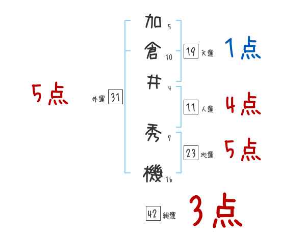 天運![]() | 加倉井秀機さんの天運は19画の1つ星!優れた才能を持ちますが、協調性が足りないことも。周りの人と協力する事を意識しましょう。 家系が持つ宿命的な運勢を表します。祖先から受け継いだ苗字ですので自分の力が及びません。家柄を象徴します。 |