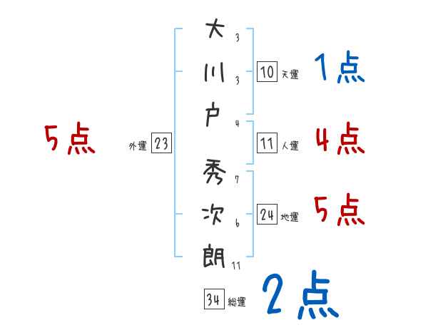 総運![]() | 大川戸秀次朗さんの総運は34画の2つ星!独創性に優れるが、自尊心が強く災難に注意しましょう。 あなたの人生を表す1番重要な運勢です。生涯を通じて影響する総合運となり、主に50歳以降の晩年期に影響を及ぼします。 |