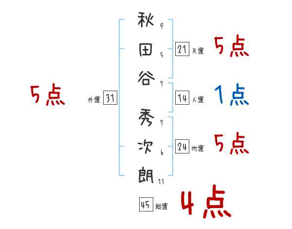 総運![]() | 秋田谷秀次朗さんの総運は45画の4つ星!もくもくと物事を進め達成する。地味な努力家。 あなたの人生を表す1番重要な運勢です。生涯を通じて影響する総合運となり、主に50歳以降の晩年期に影響を及ぼします。 |