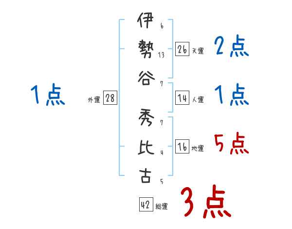 天運![]() | 伊勢谷秀比古さんの天運は26画の2つ星!波瀾万丈かも。信頼できる人を大事にしましょう。 家系が持つ宿命的な運勢を表します。祖先から受け継いだ苗字ですので自分の力が及びません。家柄を象徴します。 |