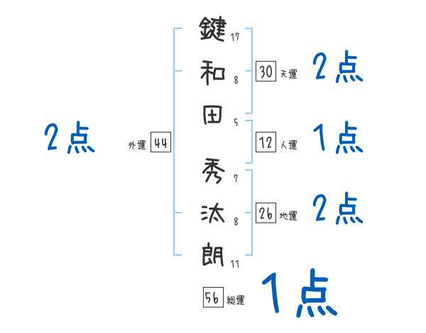 総運![]() | 鍵和田秀汰朗さんの総運は56画の1つ星!消極的で無気力になりがち。誠実な気持ちが必要でしょう。 あなたの人生を表す1番重要な運勢です。生涯を通じて影響する総合運となり、主に50歳以降の晩年期に影響を及ぼします。 |
